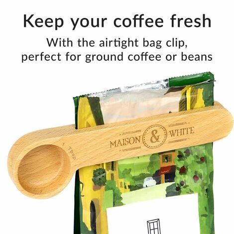 The Maison & White 2 in 1 Coffee Clip and Spoon is the ideal way to keep your coffee grounds or beans fresh. The clip includes a tablespoon measurement so you can easily measure out a brew just by using the clip stored with your coffee! Unlike serrated metal equivalents, the wood clip will not puncture or damage the bag. Use the 2 in 1 clip to easily measure out 1 tablespoon of your favourite coffee grounds to add to your cafetiere, drip filter or coffee machine or use the measurement to get the precise amount of coffee beans you need. Keeping your coffee bag airtight stops the beans or grounds from over-aerating which can cause over-bitter unpleasant tastes, by storing your coffee correctly with the Maison & White clip your coffee will have a more full-bodied and rich flavour profile. Â
