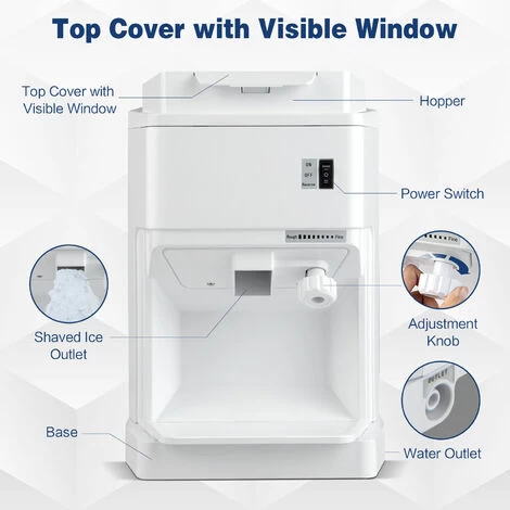 Designed with top cover, front handle, ice tray, water outlet and shaved ice outlet to bring convenience