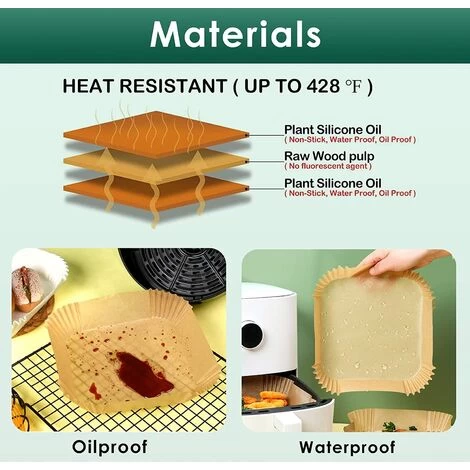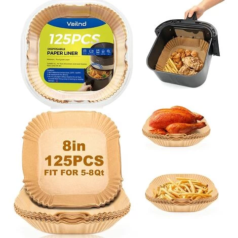 up a breeze, saves time, water and soap. [Your Air Fryer Companion]: Air fryer disposable paper was packed in a waterproof and dustproof transparent plastic box, you can clearly see the remaining amount of air fryer parchment paper liners. And it can be hung, not take up space but conspicuous. [Multiple Use]: Suitable for air fryers, microwave ovens, ovens, steamers, etc. Air fryer paper liners can be used for baking, roasting, frying or holding food, lightweight and practical. [Size]: Firstly, find out capacity of air fryer basket. This parchment paper for air fryer disposable of 8 bottom diameter fits both round and square baskets between 5 and 8 qt. For dual basket air fryer, just put a piece of air fryer paper liner in  Â