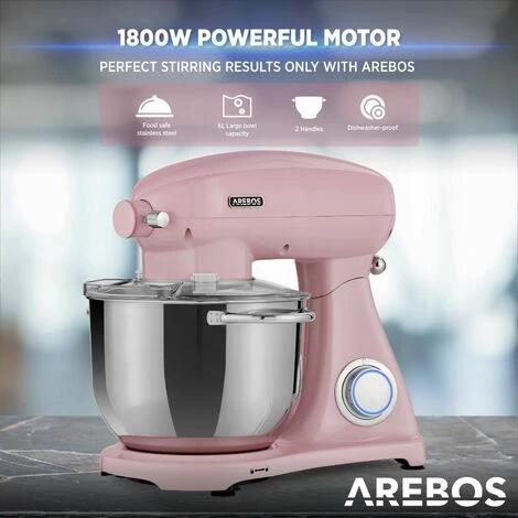 【Quick and convenient anti-slip design】The AREBOS food mixer includes several accessories: whisk, dough hook, and beater. The built-in blue LED light indicates the 6 different speed settings, such as for whisking eggs, kneading dough and many more functions. 4 anti-slip feet ensure quiet and secure footing during operation.
