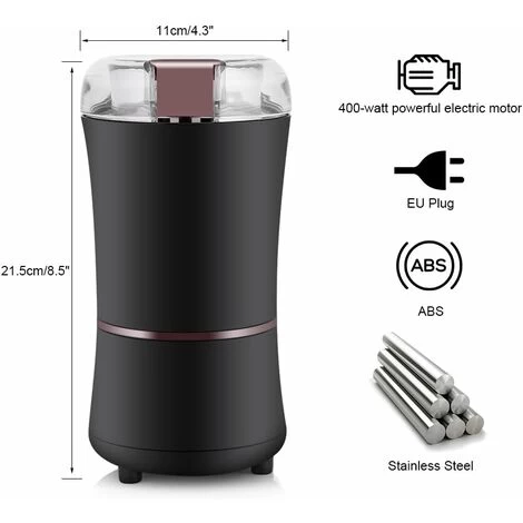 Features Sharp, Stainless-steel Blades and interior for fast-even Grinding, durability and easy cleaning. Powerful 400-watt motor Electric quickly and quietly grinds up to 3 ounces Coffee Beans to your desired texture. Easy to use: Fill Beans in the