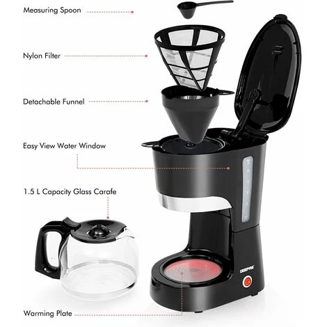 GEEPAS 1.5L COFFEE MAKER Hey, can i get you a Coffee! Provides you with rich, perfectly brewed coffee in a few minutes. The entire system is automated. Just push the buttons to adjust it according to your taste, and it’s done. Moreover, the glass carafe and funnel are both dishwasher safe. Just put them inside and get them out when cleaned.