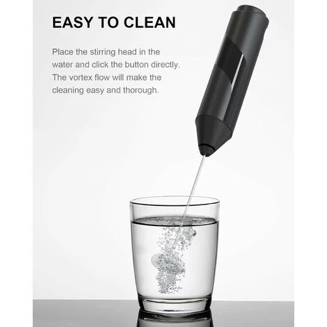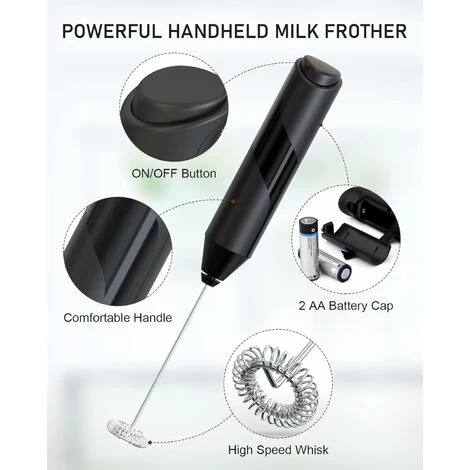 [Powerful and Fast]: The portable milk frother features a 14,000 RPM speed with a food-grade stainless steel whisk and BPA-free shaft, perfect for creating froth in 15-20 seconds for a coffee, latte, milk, hot chocolates and matcha powder. [Lightweight and Portable]: Only 0.13 lbs weight which saves more space and can be carried anywhere you want to have a drink. A great mini foam maker when on a short trip, camping or having a barbecue outside. [Easy to use]: Simple one-touch button with low noise, just put it in a container with liquid food until about 1/3 foam, and it will stop working when you release the button. The drink mixer can be used over 1000 times. [Convenient Battery Operated]: The frother is battery operated with 2 AA batteries (not included), just change the battery directly when the frother is off, so missing cords or searching for outlets won’t happen.