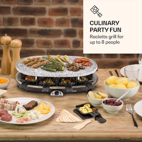 Feast like on New Year’s Eve: with the All-U-Can-Grill Raclette, you can treat 8 people at the same time to the finest delicacies for any occasion. Whether a classic raclette feast, finely grilled meat and vegetables, savoury crêpes or sweet pancakes – this raclette grill keeps what its name promises: All-U-Can-Grill. The taste-neutral natural stone plate allows you to grill fat-free and you can easily exchange it with the pre-formed light metal plates for pancakes, crêpes and conventional grilling. The up to 1500 Watt heating coils underneath guarantee a good result.