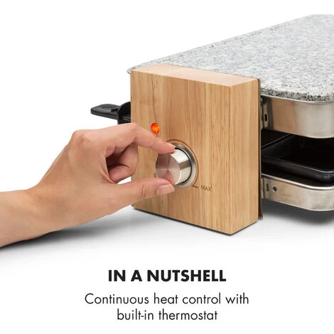 The Klarstein Prime Rib Raclette Grill turns eating together into an experience. You can cook meat, fish, vegetables or pasta to perfection on its generous natural stone plate. The powerful, steplessly adjustable heating element heats the solid granite stone quickly and evenly. On the bottom shelf, there is room to cook cheese, potatoes or other delicacies in 8 pans at the same time. Two visually appealing wooden feet reliably support the simple stainless steel housing and ensure a secure position. To clean the stone plate, simply remove it after it has cooled down and wash it with water and normal washing-up liquid.