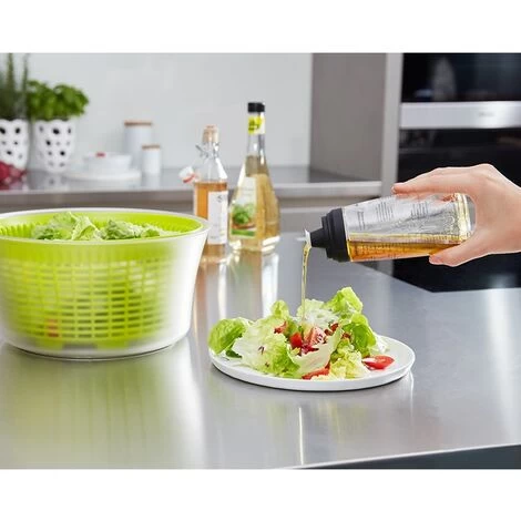 With the Dressing Shaker from Leifheit, mixing an exquisite salad sauce is simple and easy. Unlike most other dressing shakers, it has an anti-drip spout. This guarantees nothing gets lost and that work surfaces and hands stay clean. The shaker’s high-quality glass is printed with a measuring scale in ml and fluid oz. as well as with practical recipe scales. You’re thus always guaranteed to have the right mixture and the recipes are always to hand all without a single extra measuring jug. The filling volume of 300 ml is also sufficient for large quantities. The glass and product label are both dishwasher safe. Thanks to the securely fastening plastic lid, the shaker can also be used to store salad sauces.