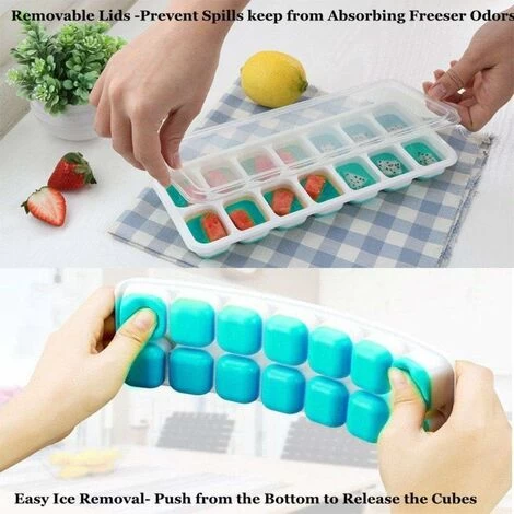 【Stackable and Removable Lid】Ice cube trays with removable lid. With this clever tool, you can make beautiful cubes, while ice cubes won’t absorb freezing smells. Also, these compartments stack easily and neatly in the freezer without sticking.