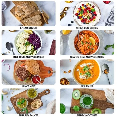 ACCESSORIES INCLUDED – Extra-large feed tube, triple pusher, stainless steel blade, BlenderMix, dough blade, egg whisk, 2mm slicing / grating disc, 4mm slicing / grating disc, spatula, storage box, recipe book.