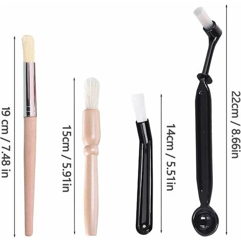 4 Pieces Coffee Cleaning Brush: 1×double-headed long handle plastic coffee brush, 1×plastic short handle coffee brush with , 1 × stiff brush long-handled wooden brush with small head, 1× thick handle soft bristle wooden brush. Different types of cleaning brushes give you more cleaning options.