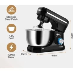 VonShef Black Food Mixer – Electric 8 Speed 1000W Stand Mixer, 4.5L Stainless Steel Mixing Bowl, Beater, Dough Hook & Balloon Whisk For Baking